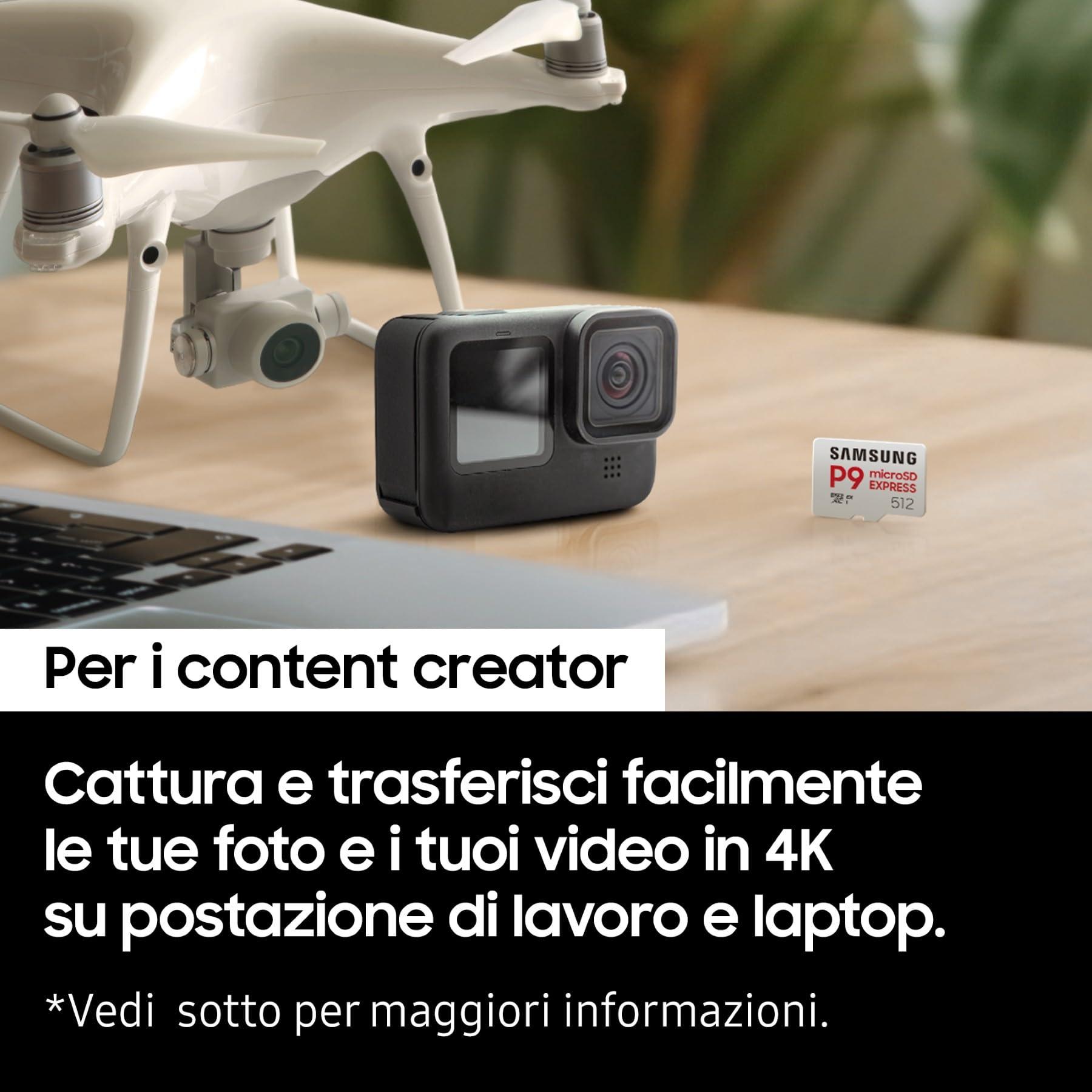 - VELOCITÀ CHE FA LA DIFFERENZA: con la microSD Samsung P9 Express potrai goderti tempi di caricamento rapidi sulle console gaming e prestazioni 4K nelle fotocamere. Resistente, affidabile e con spazio di archiviazione per tutte le tue avventure.