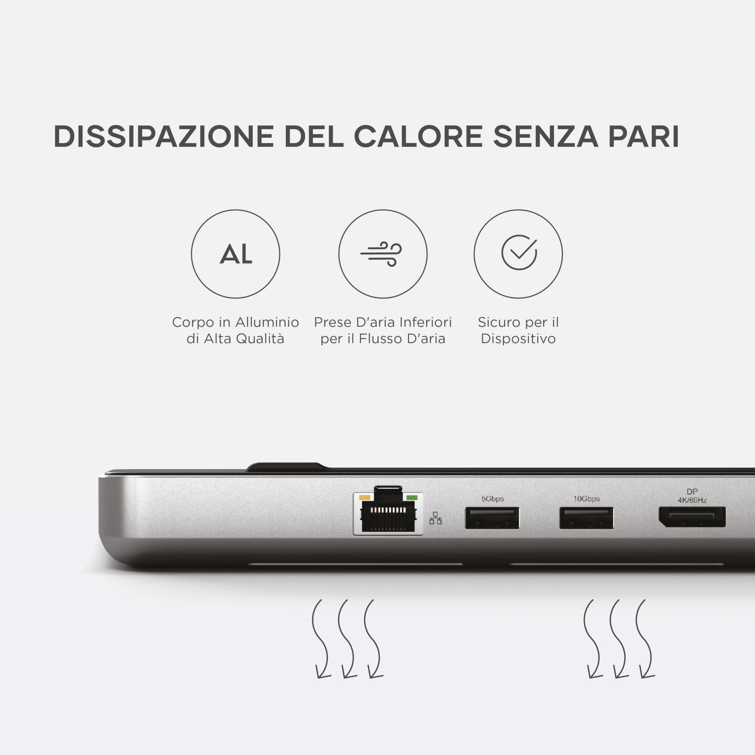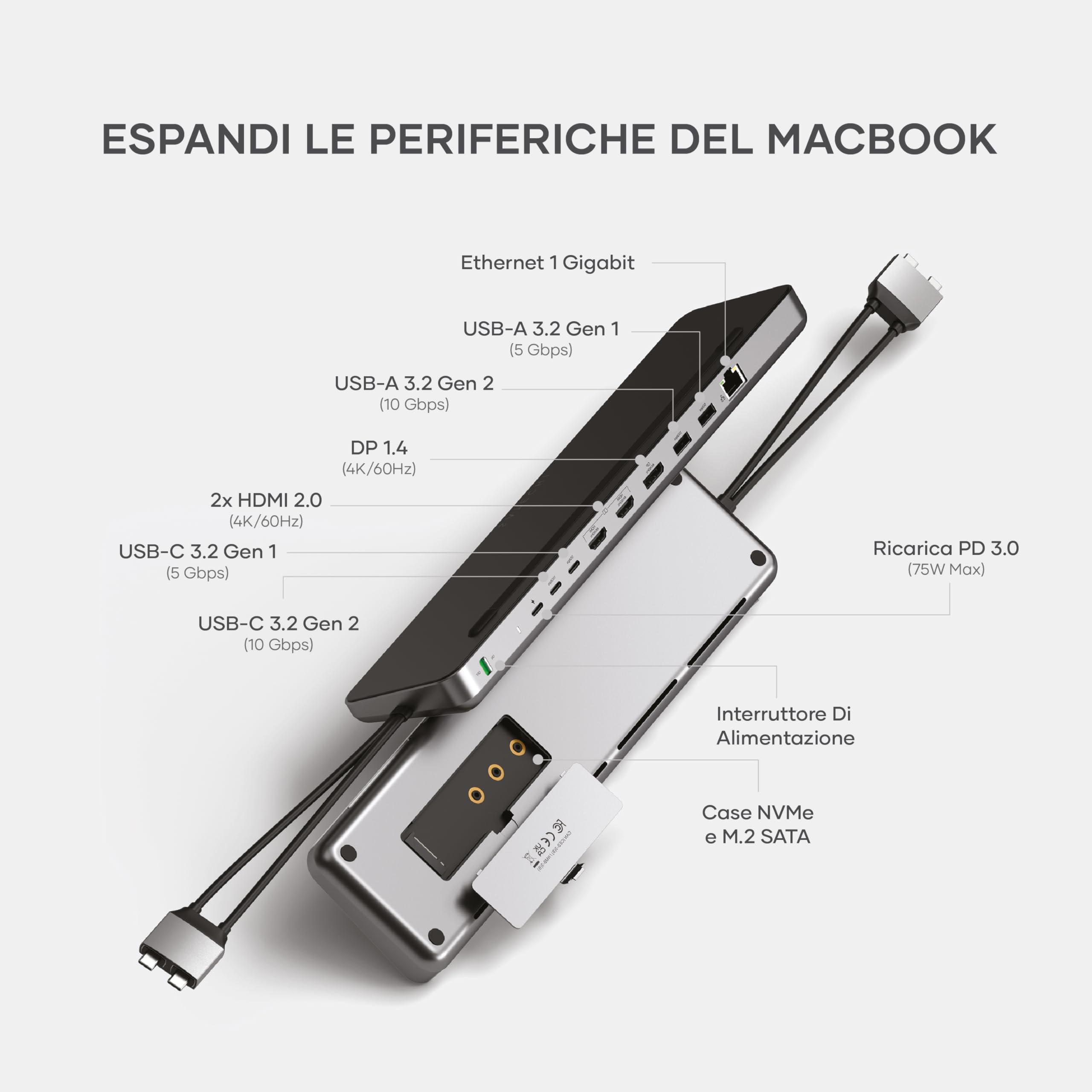 - ADATTATORE 10 IN 1 COMPLETO – potenzia il tuo spazio di lavoro con un adattatore USB C che integra Ethernet Gigabit, DisplayPort, due porte HDMI, alloggiamento SSD e diverse porte USB-A e USB C con velocità fino a 10Gbps. Include anche una porta USB C da 75W per alimentare il dispositivo.