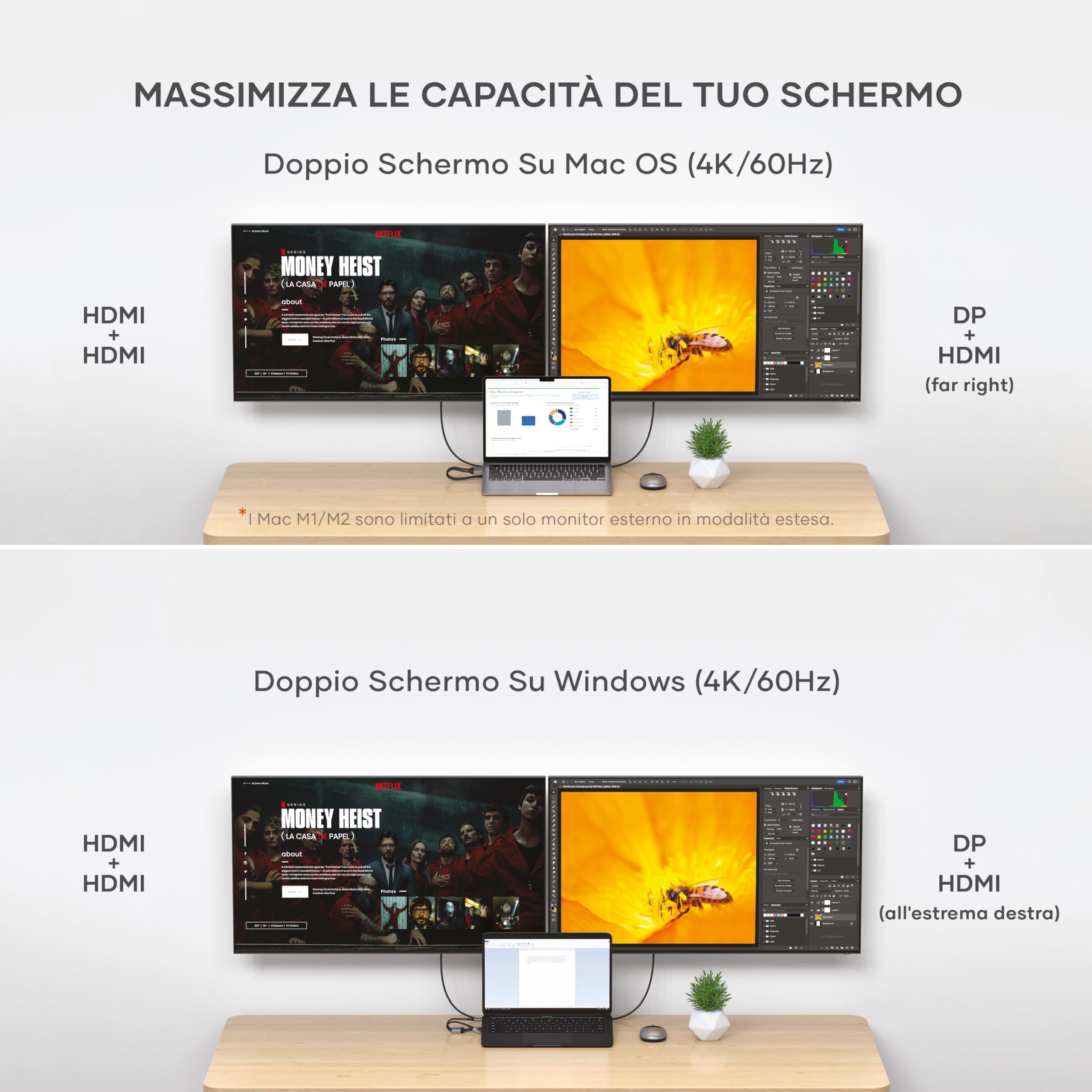 - ESTENSIONE DELLO SCHERMO – Collega fino a due monitor esterni in modalità estesa tramite due porte HDMI o tramite DisplayPort e HDMI. I display funzionano in modo indipendente senza software o driver. Nota: i Mac M1/M2 supportano un solo monitor esterno in modalità estesa.