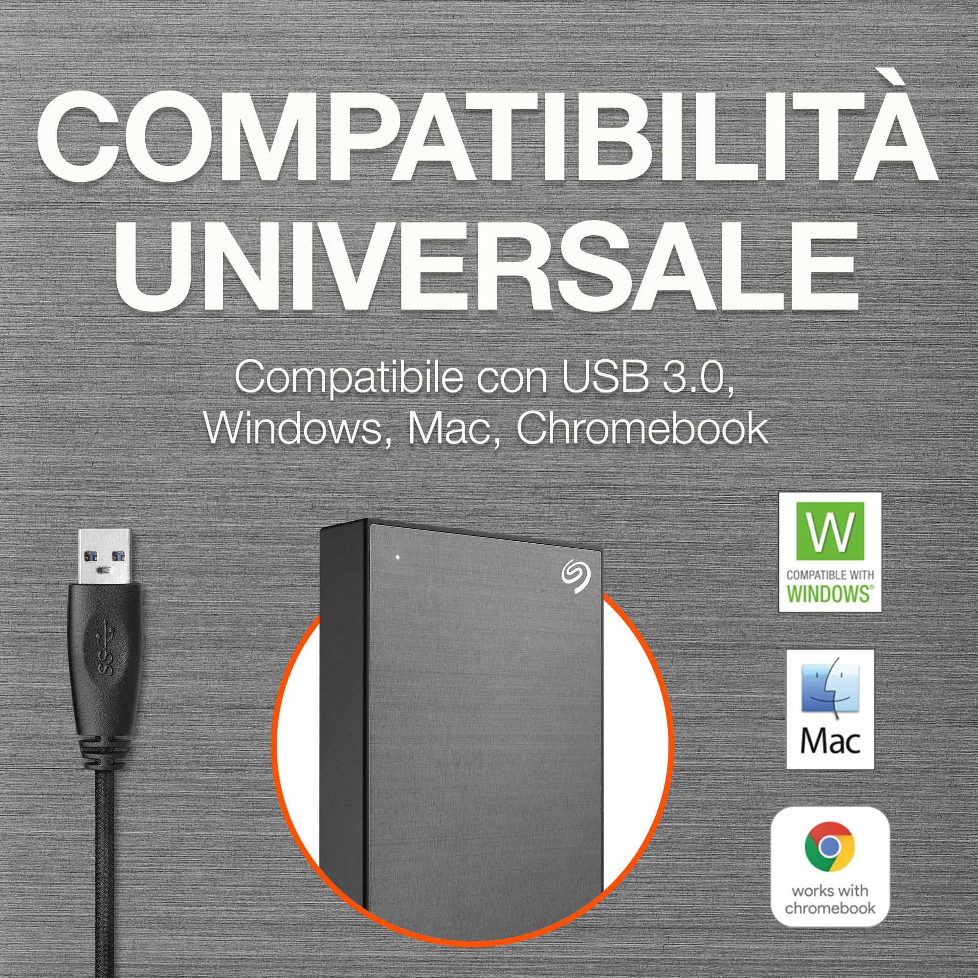 - Questa unità esterna include un cavo USB totalmente compatibile con PC portatili Windows, Mac e Chromebook (l’adattatore per l'uso con porte USB-C deve essere acquistato a parte e potrebbe essere necessaria la riformattazione per l'uso con Time Machine).