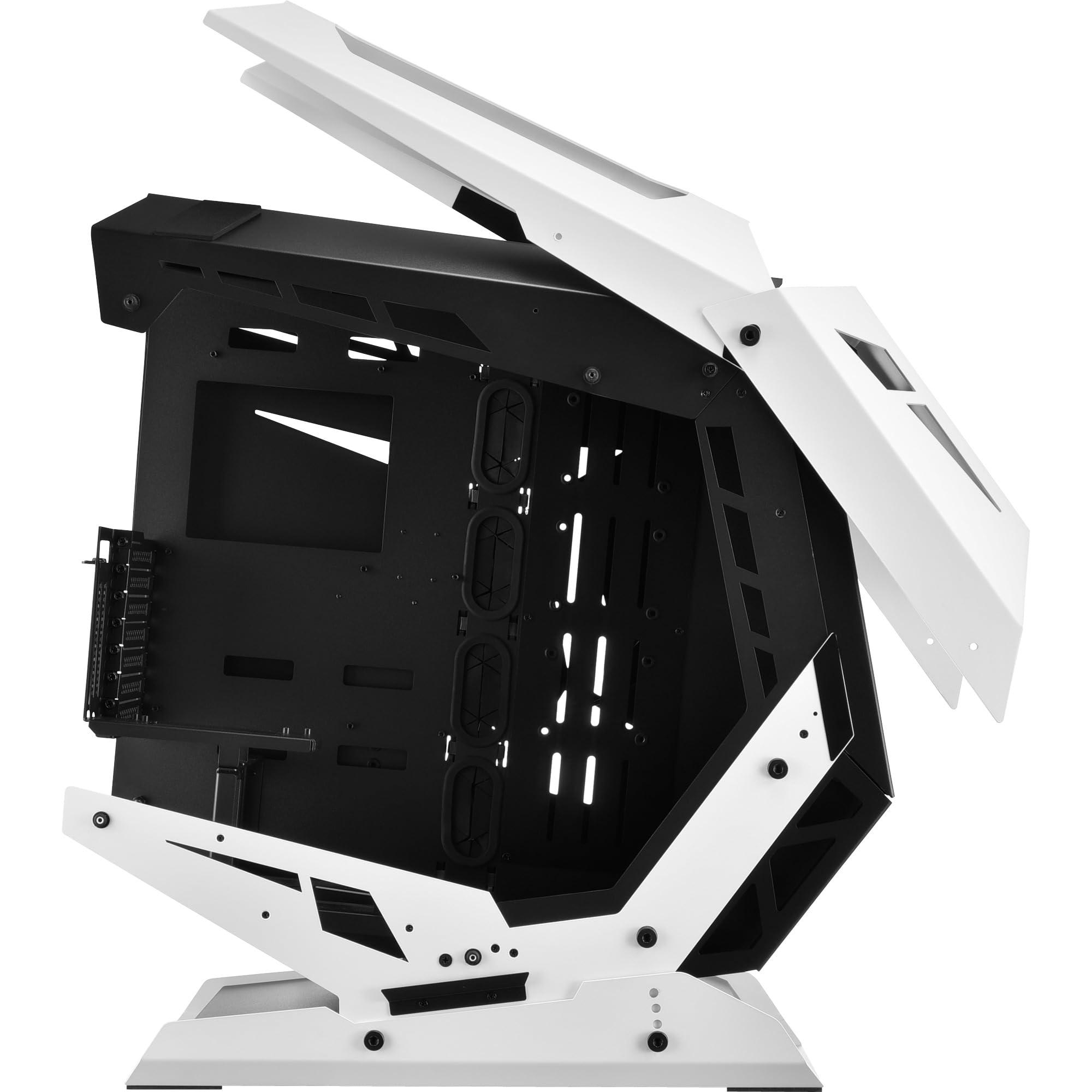 - Davvero anticonvenzionale. L’ELITE SHARK CA700 stupisce con la sua forma non convenzionale, oltre che per la sua grande base. Il case non si limita ad essere meraviglioso, ma offre anche l’opportunità di inclinarlo e di posizionarlo in quattro modi diversi. Sul lato destro del case è possibile ordinare i cavi con facilità e nasconderli dietro al pannello laterale. Il pannello laterale in vetro è installabile e rimovibile molto semplicemente, grazie a una staffa di montaggio che lo supporta dal basso.