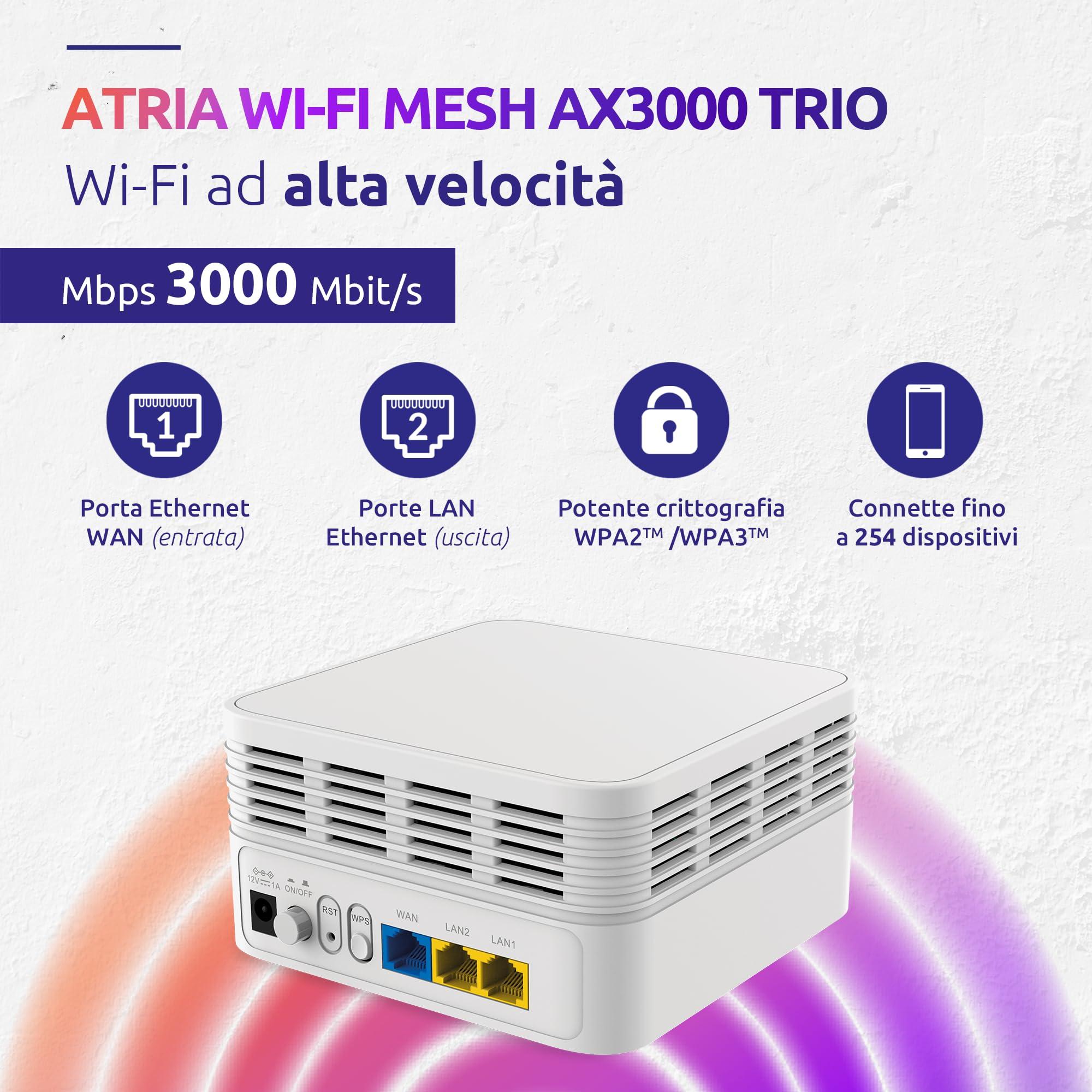 - VERSATILE E SICURO: Il sistema Atria Mesh AX3000 può essere configurato come rete Mesh, access point o router. Fornisce sicurezza completa con crittografia WPA/WPA2/WPA3 e pulsante WPS per una facile connessione dei dispositivi.