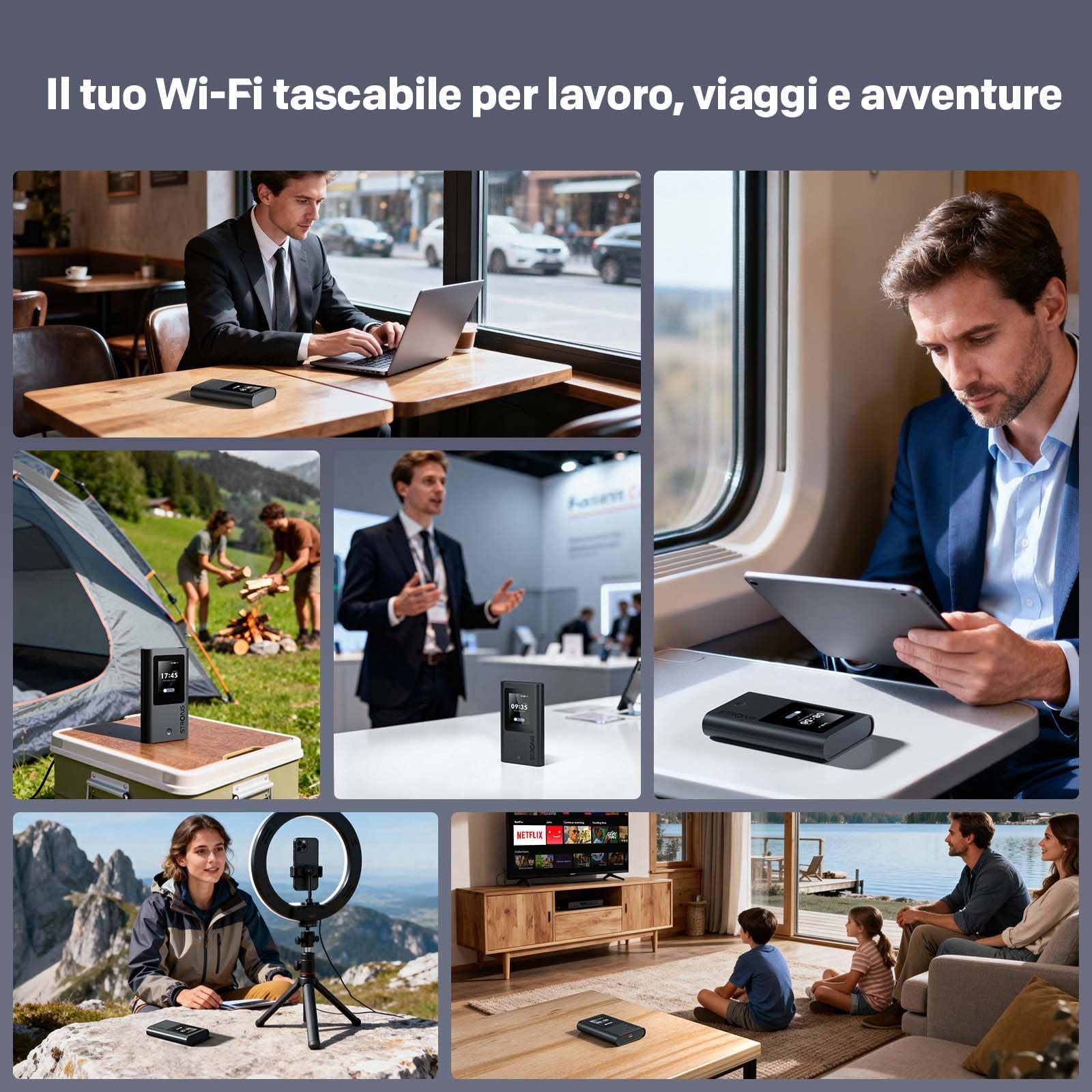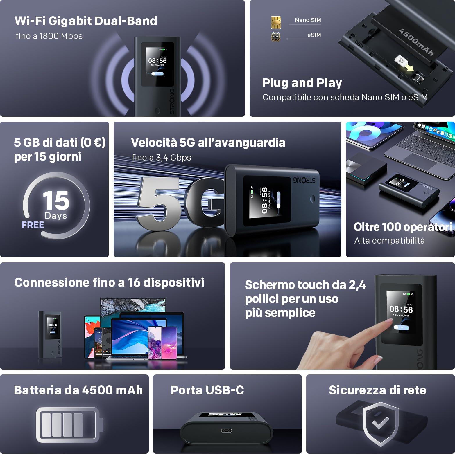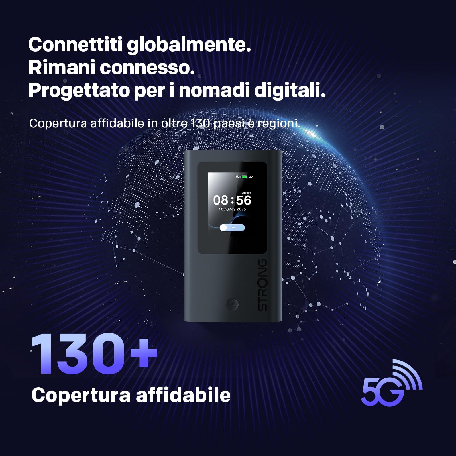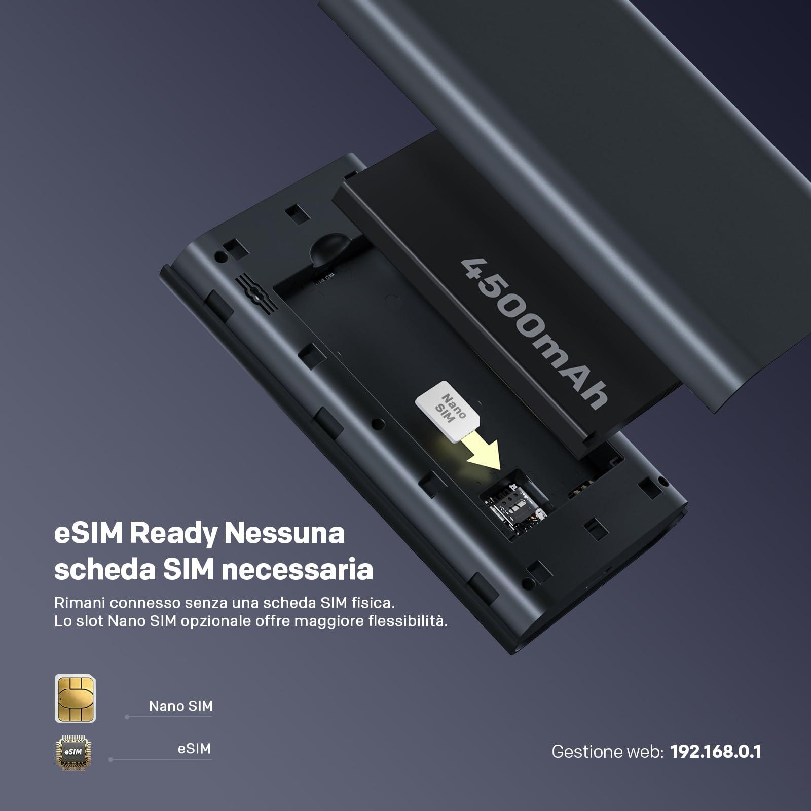 - Plug & Play con eSIM/SIM Nano – Hotspot 5G portatile sbloccato compatibile con oltre 100 operatori nel mondo. Nessuna app o configurazione richiesta: accendi e connettiti.