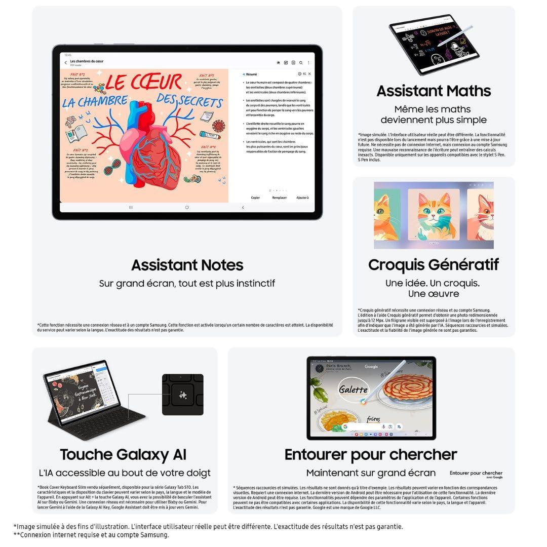 Samsung Galaxy Tab S10+L'intelligenza artificiale Galaxy è quiDesign iconicoL'innovazione è presente in ogni dettaglio, con nuove funzionalità nella S Pen, nell'area di ricarica e nella fotocamera. Inoltre, è stata posta grande cura nei materiali per offrire una magnifica esperienza tattile.Scegli tra due colori: grigio o argento, ciascuno con la sua S Pen abbinata. Disponibile per Galaxy Tab S10+ | Scheda S10 Ultra!Galaxy AI ottimizzata per il grande schermoHai già visto Galaxy AI , ma mai come adesso. L'ampio schermo della nuova serie Galaxy Tab S10 dà vita in grande stile alle funzionalità Galaxy AI, massimizzando produttività e divertimento.Il tuo assistente personale per prendere appuntiPrendi appunti dalle tue riunioni mentre partecipi attivamente ad esse oppure registra la riunione e lascia che Galacy AI converta l'audio in testo. Inoltre, puoi anche formattare e riassumere quelle note senza troppi sforzi, più facilità per te!Mantenere i tuoi appunti impeccabili è più facile con Split View , ti aiuta a formattare senza perdere di vista i tuoi primi appunti.La funzione Solve Math trasforma il calcolo in un gioco da ragazzi, risolvendo automaticamente formule complesse. E l'Aiuto per la scrittura può decifrare la tua calligrafia. Provalo!Grande o GRANDE.Immergiti in colori più profondi e neri più realistici, ottimizzati per il display Dynamic AMOLED 2X . Vivi un'esperienza cinematografica con una risoluzione incredibile e interazioni più fluide. Molti lo considerano lo schermo definitivo.Riduci i riflessi e migliora la visibilità grazie alla tecnologia antiriflesso e al potente Vision Booster .Fresco anche quando la temperatura del gioco aumentaAumenta l'emozione con un processore ultraveloce e potente . Quando l'azione si fa davvero seria e le temperature aumentano, la sua camera di vapore più grande è responsabile di mantenere fresco il sistema di raffreddamento. È progettato per raffreddarsi in modo più efficiente, ovvero più tempo trascorri giocando o guardando video.Più batteria. Altri giochi. Altri videoBatteria da 10090 mAh . Gioca per ore e ore, fai una maratona delle tue serie preferite e usa il suo caricabatterie Super Fast Charge per averlo al 100% della batteria in tempi record.Cattura il tuo mondo intero con la sua fotocamera ultra grandangolareLa fotocamera frontale ultra grandangolare garantisce un'inquadratura perfetta durante le tue videochiamate e ti permette di catturare video e foto in HD che potrai poi modificare direttamente sul tuo Galaxy Tab Serie S10.