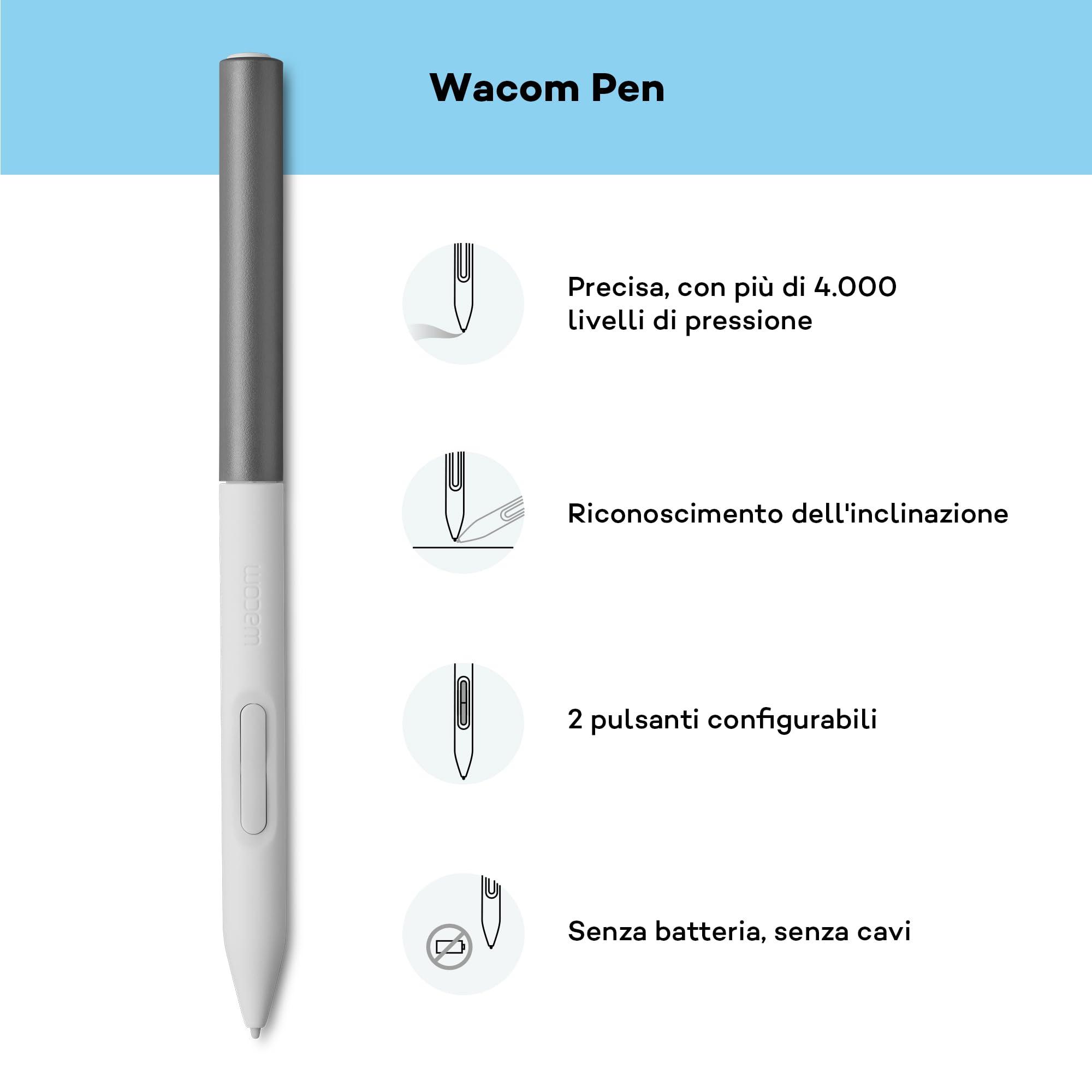 - Tavoletta con penna Wacom One S, sottile e versatile, con Bluetooth e input naturale tramite penna. Perfetta per creativi principianti, per prendere appunti e apporre firme in digitale.