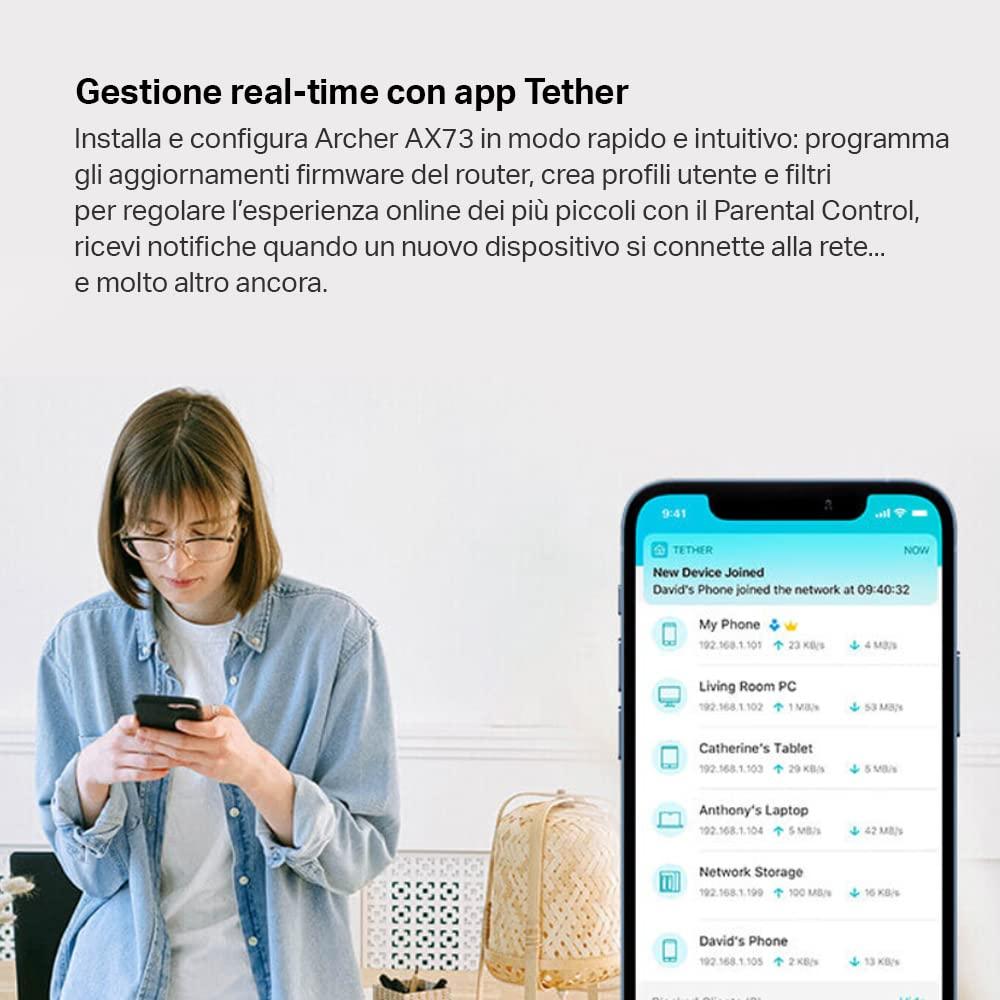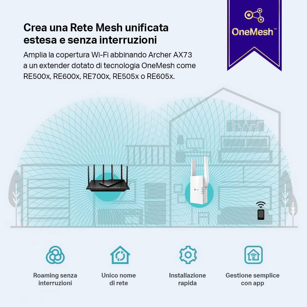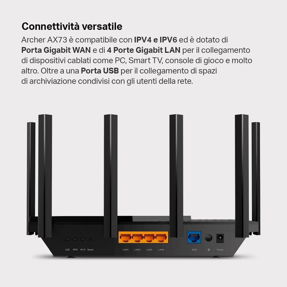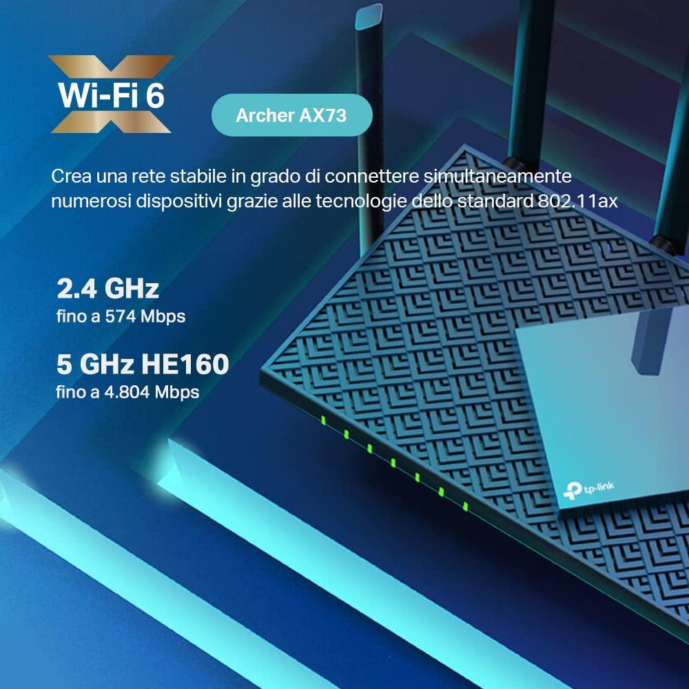TP-Link Archer AX73 Router Wi-Fi 6 Dual-Band AX5400Mbps, 5 Porte Gigabit, 1 Porta USB 3.0, Router F (FTTH | FTTB | Ethernet), TP-Link HomeShield, OneMesh, Tether App, Compatibile con Alexa