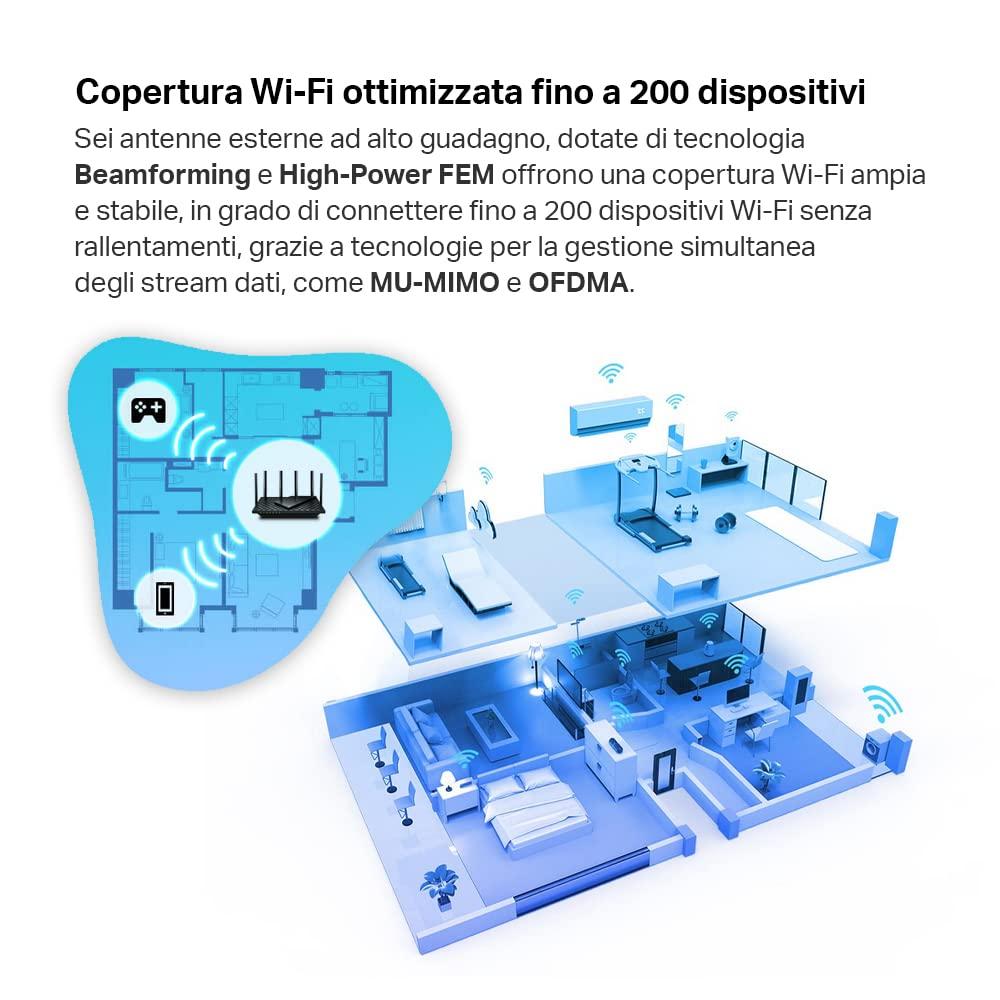 - [Connessione di più di 200 Device] – Supporta MU-MIMO e OFDMA per ridurre la congestione di rete e quadruplicare il throughput medio