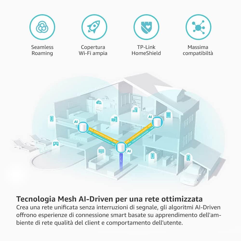 - Copertura WiFi al 100 percent con MESH 6 - Lo chassis Deco X50 a 3 pacchetti offre un'elevata copertura fino a 604 m², consentendo di collegare più di 150 dispositivi contemporaneamente. Metti fine ai punti morti