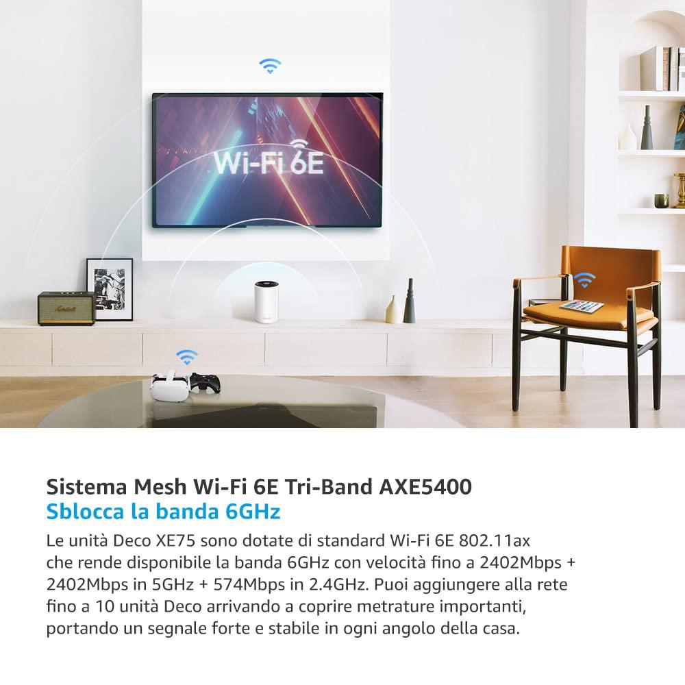 TP-Link Deco XE75 (3-pack) Mesh Router AXE5400 Wi-Fi 6E Tri-Band, Per Tutta La Casa, Porta Gigabit, 802.11ax 6 GHz, AI-Driven, TP-Link HomeShield, MU-MIMO, OFDMA