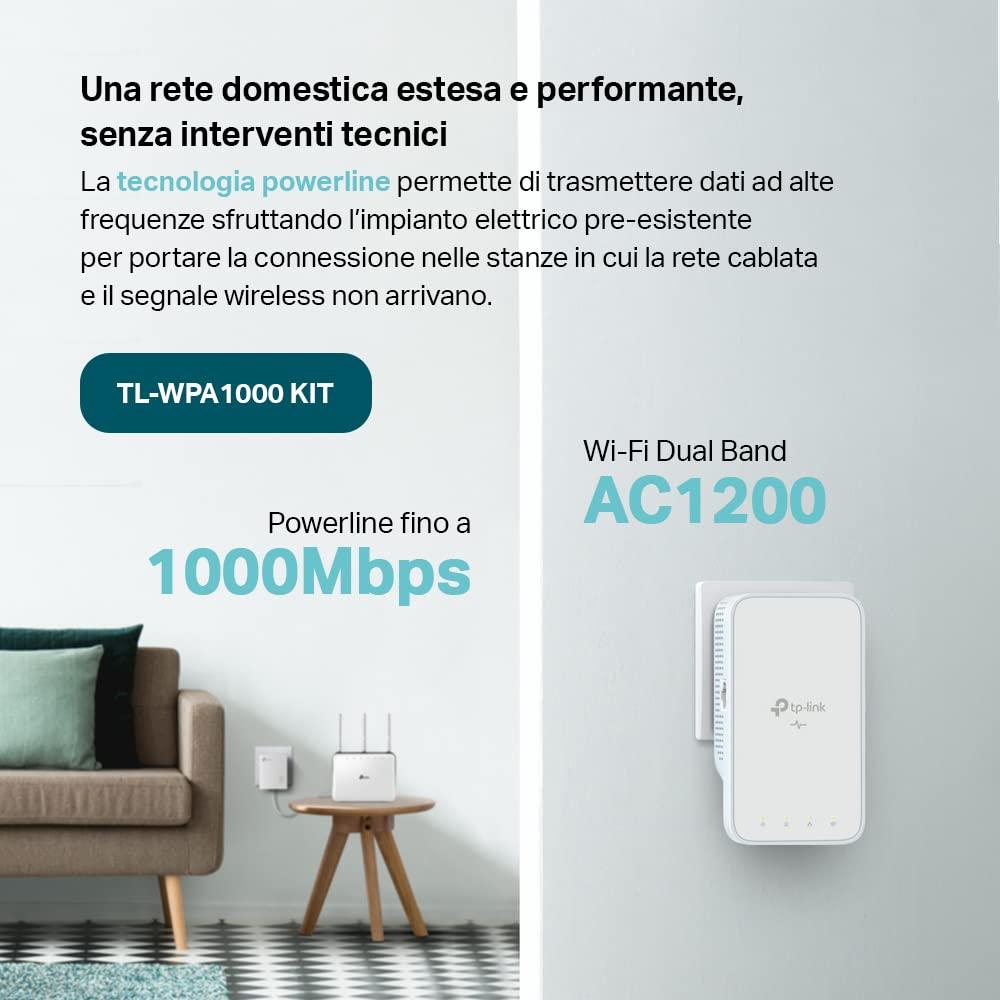 TP-Link TL-WPA1000 Kit Powerline, AV1000 Mbps su Powerline, AC1200 su WiFi Dual Band, 1 Porta Gigabit, Plug & Play, Homeplug AV2, Tecnologia OneMesh, Estendi Rete Tramite Impianto Elettrico