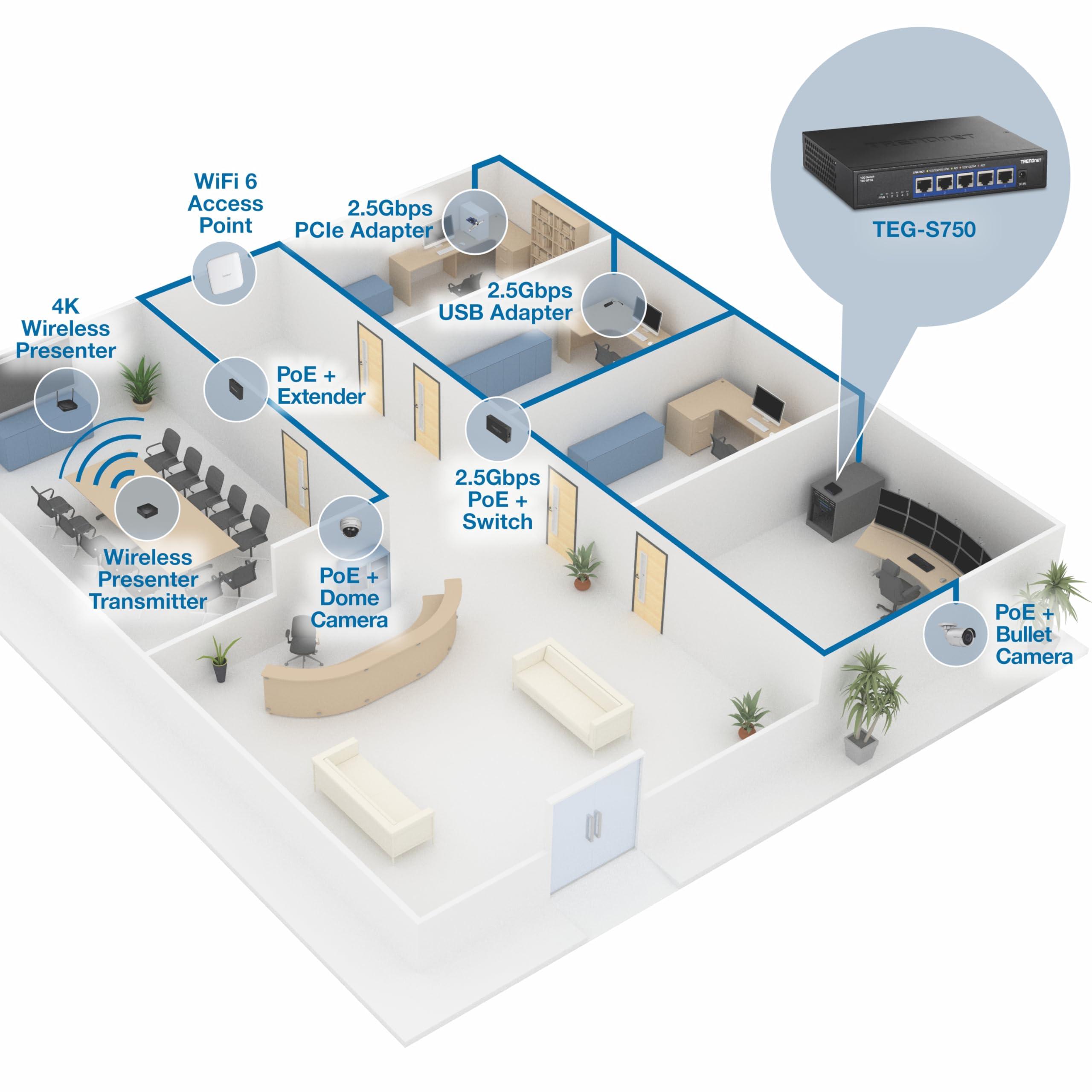 TRENDnet TEG-S750 Switch 5 porte 10G, 5 porte RJ-45 10G, capacità di commutazione 100 Gbps, supporta connessioni 2,5G e 5G-Base-T, protezione a vita, nero,