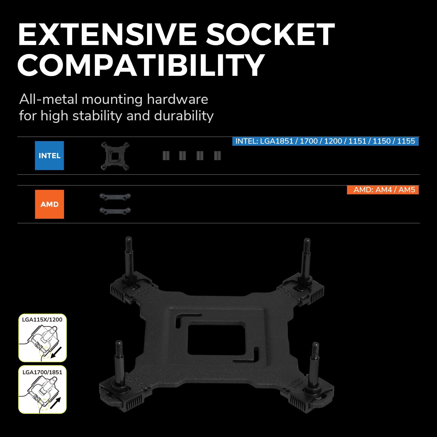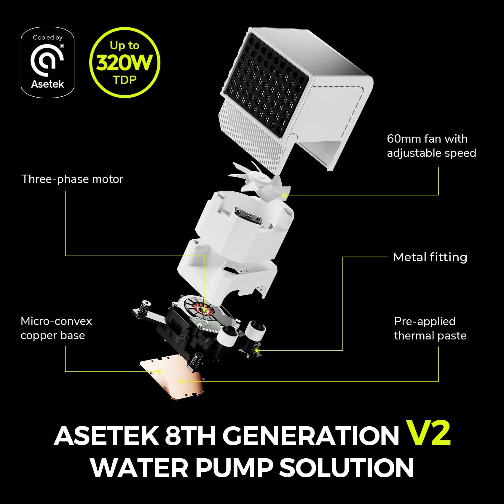 - ASETEK 8. Pompa GEN V2: l'AIO da 360 mm con la sua potente pompa e tubi più spessi supporta 320 W TDP. Il radiatore spesso 30 mm con alette ad alta densità garantisce un'efficiente dissipazione del calore