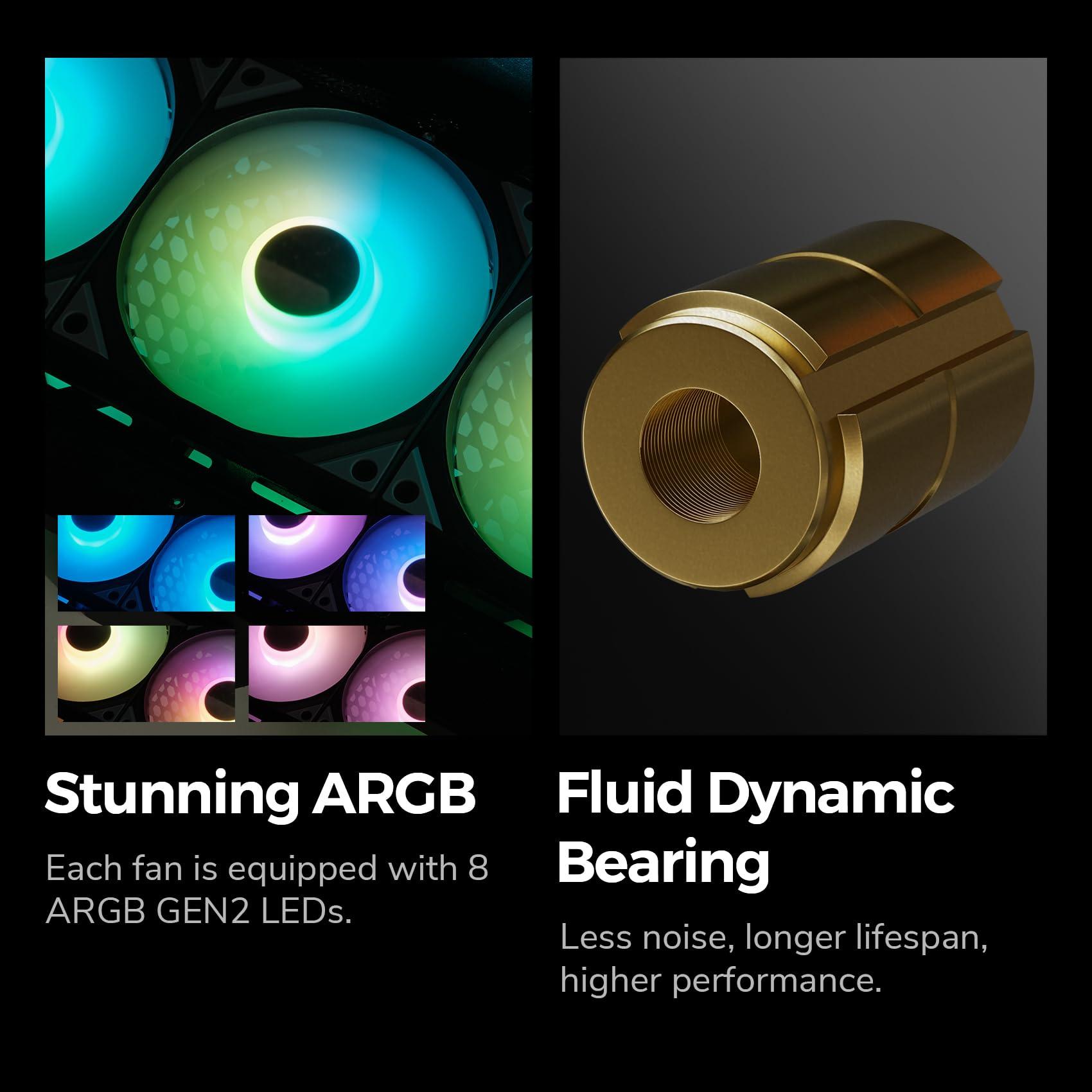 - EFFETTI RGB: tre ventole ROTA SL ARGB da 120 mm preinstallate con cuscinetti FDB forniscono 111,52 m³/h di flusso d'aria, 2,49 mmH₂O pressione statica e rimangono sotto i 28,87 dB(A) anche a pieno carico.
