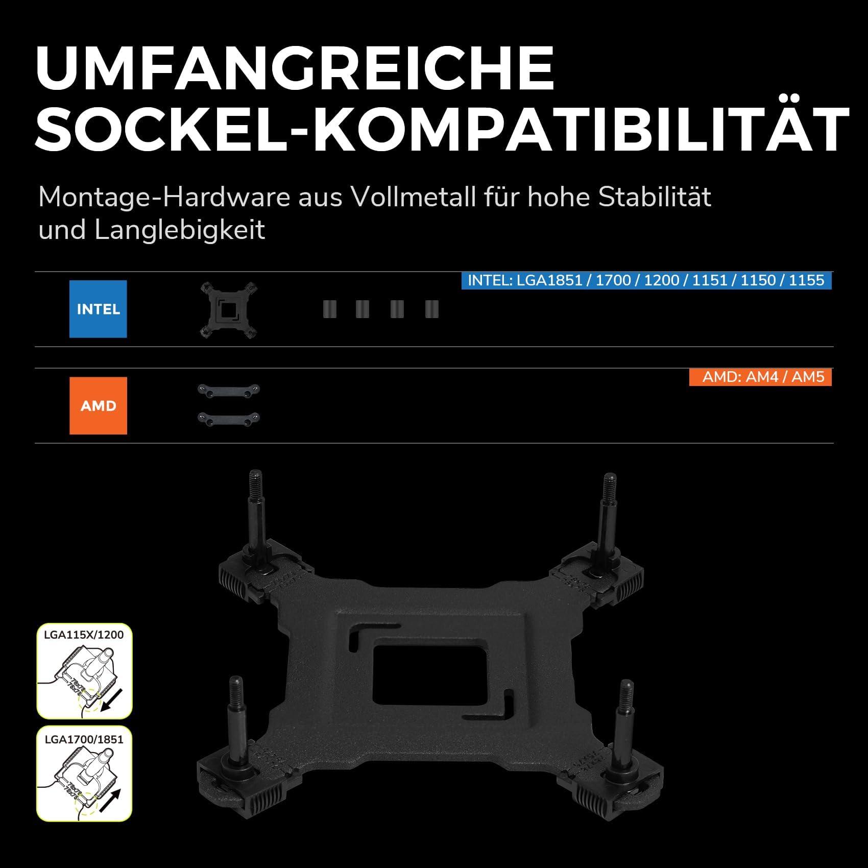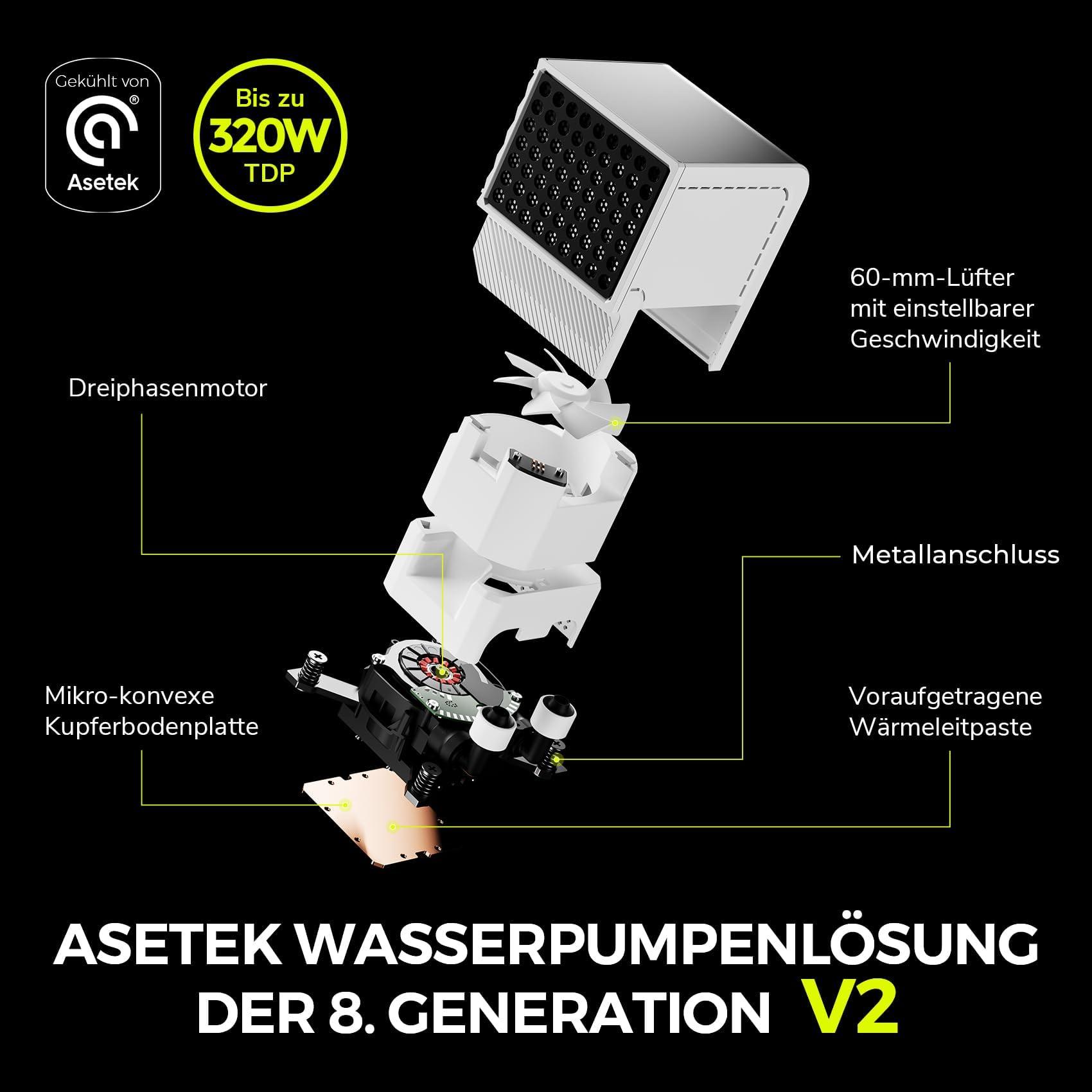 - ASETEK 8. GEN V2 POMPE: La AIO da 360 mm con la sua potente pompa e tubi più spessi supporta un TDP di 320 W. Il radiatore da 30 mm di spessore con alette ad alta densità garantisce un'efficiente dissipazione del calore