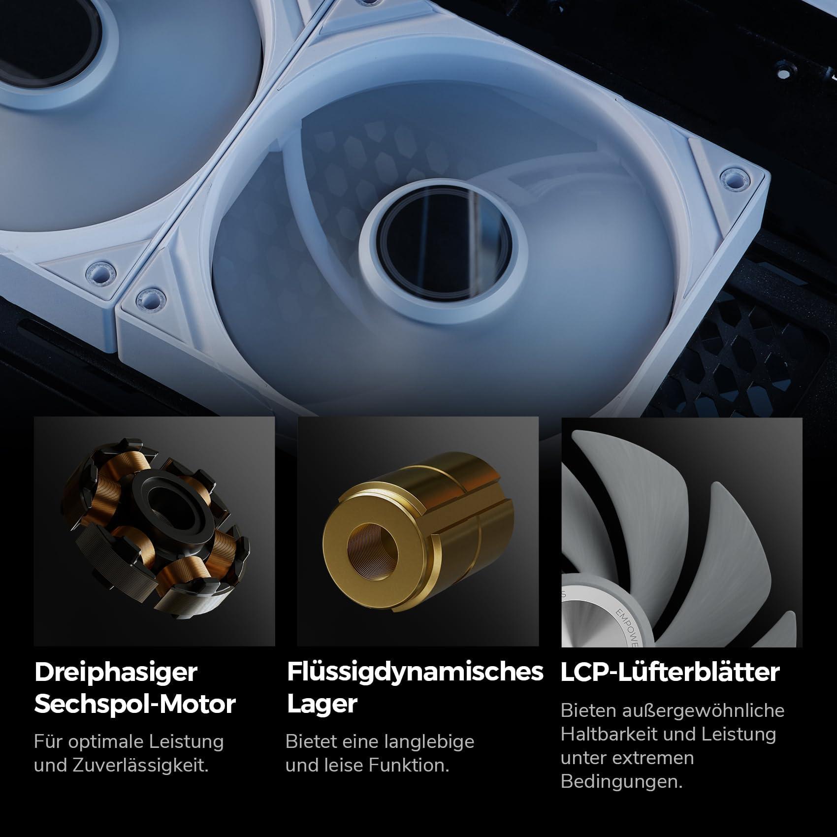- POTENZA SILENZIOSA: Tre ventole ROTA SL Pro da 120 mm preinstallate in materiale LCP di colore bianco forniscono un flusso d'aria di 138,16 m³/h, una pressione di 3,66 mmH₂O e rimangono sotto i 30,97 dB(A) – silenziose ed efficienti'