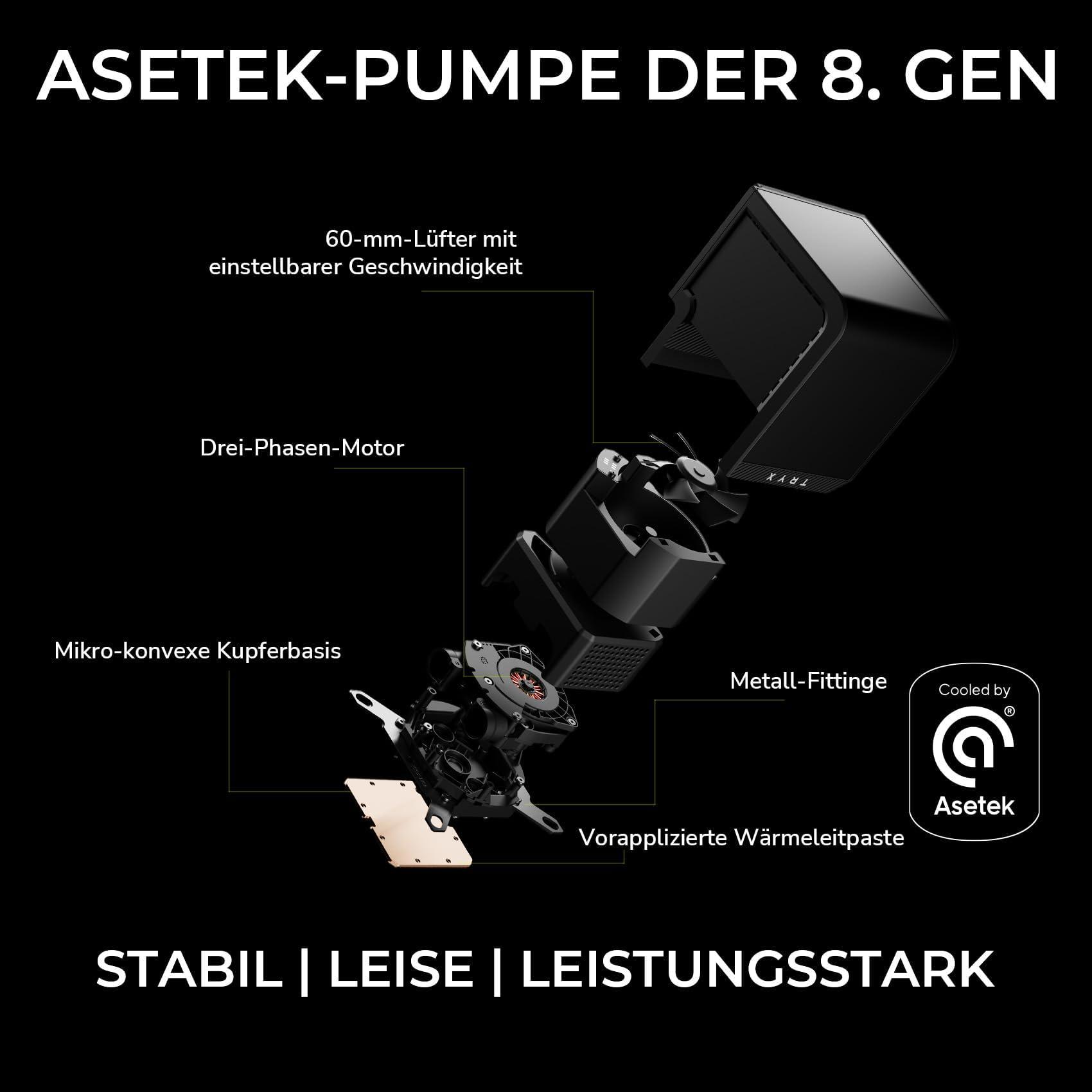 - ASETEK 8. Pompa GEN: il refrigeratore d'acqua AIO da 240 mm dispone di una pompa con potente motore a 3 fasi, TDP da 280 W e tubi più spessi del 40%. Il radiatore da 30 mm con lamelle ad alta densità garantisce un efficiente trasferimento di calore