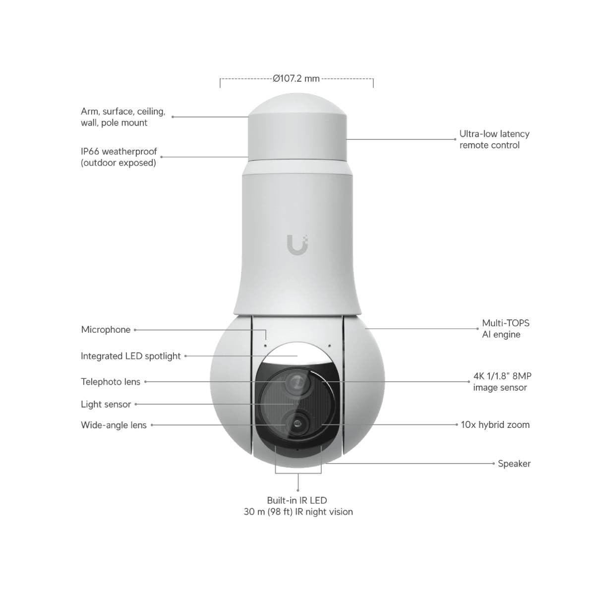 Ubiquiti All-weather 4K dual-lens camera with 10x hybrid zoom 1/1.8 8MP image sensor Multi-TOPS AI Engine and ultra-low latency pan-tilt-zoom control for motion tracking.