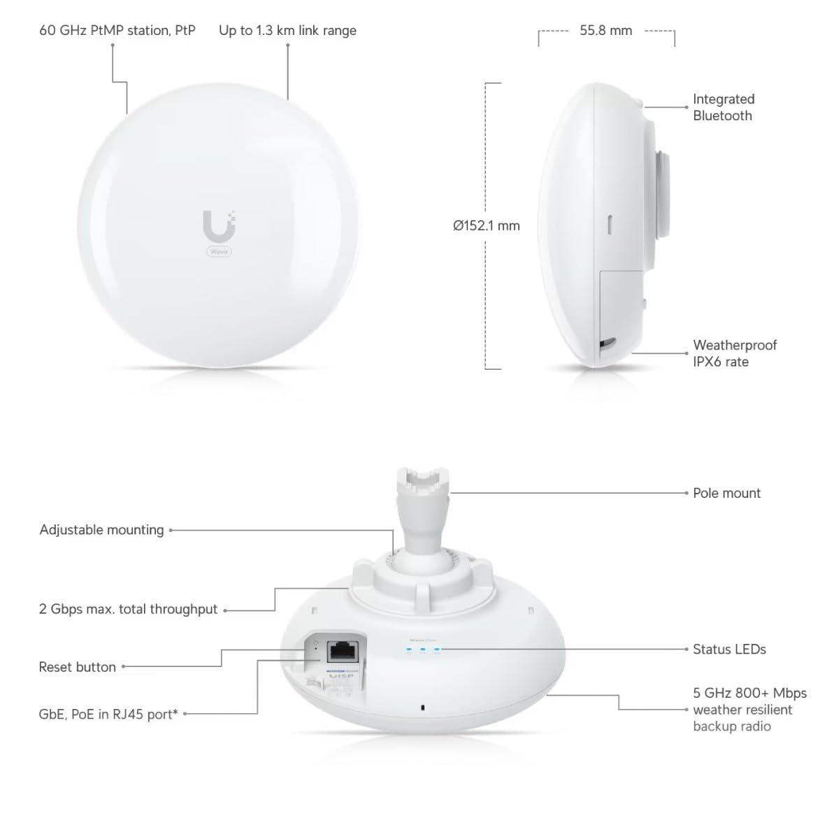 Ubiquiti UISP Wave Pico. Velocità massima di trasferimento dati: 800 Mbit/s, Distanza massima di trasmissione possibile: 1300 m. Design dell'antenna: Interna, Livello di aumento dell'antenna (max): 27,7 dBi. Banda WLAN: banda singola (5 GHz), standard WLAN superiore: Wi-Fi 6 (802.11ax), banda di frequenza: 5,18 - 5,875 GHz. Tipo di interfaccia Ethernet LAN: Multi-Gigabit Ethernet, Ethernet LAN Velocità di trasferimento dati: 10.100.1000.2000 Mbit/s. Tecnologia di trasmissione: cablata e wireless