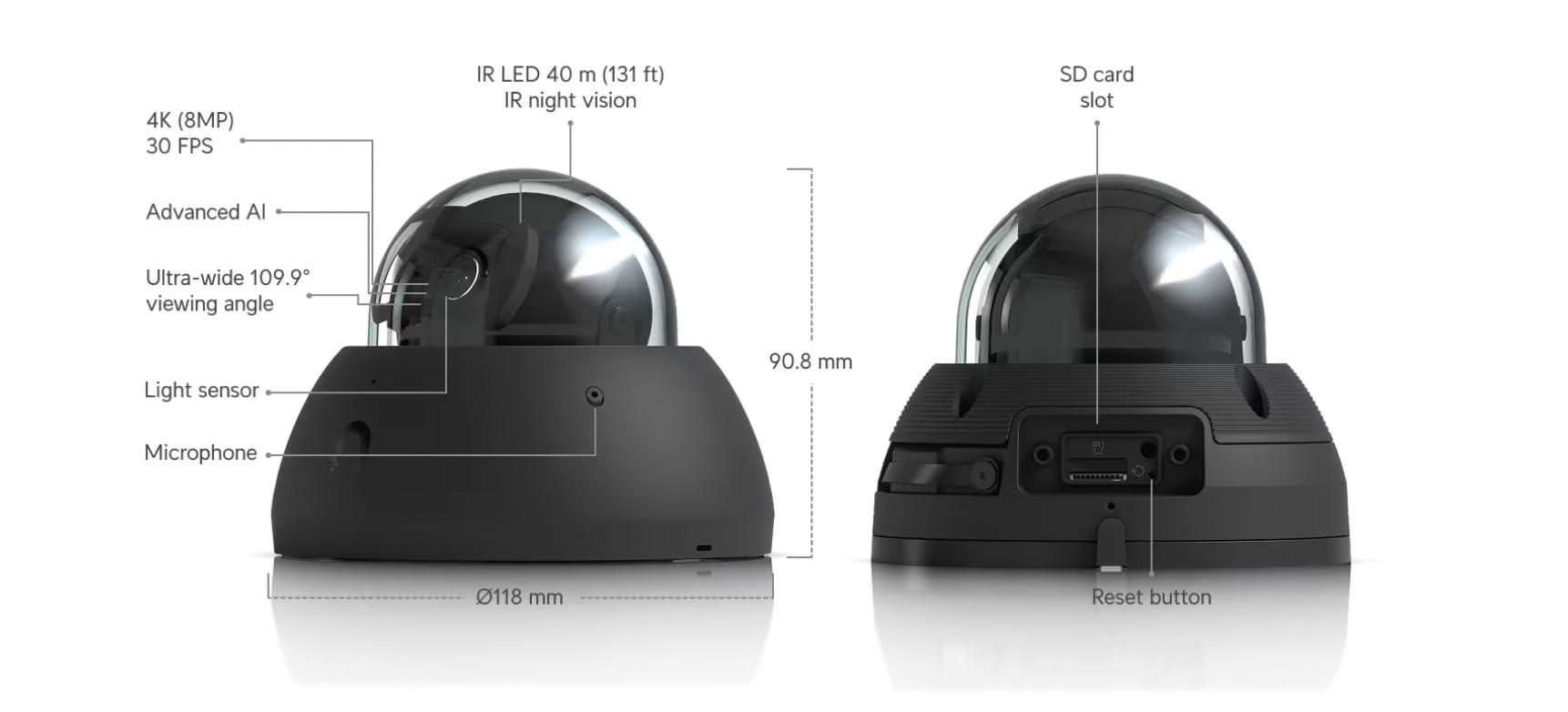 Torretta Ubiquiti AI. Tipo: Telecamera di sicurezza IP, Posizionamento assistito: interno ed esterno, Tecnologia di trasmissione: Cablato. Tipo di montaggio: Soffitto/Parete, Colore del prodotto: Nero, Fattore di forma: Torretta. Angolo di visione (orizzontale): 109,9°, Angolo di visione (verticale): 56,7°, Angolo di visione dell'obiettivo, diagonale: 134,1°. Dimensioni del sensore di immagine: 25,4 / 1,8 mm (1 / 1,8"). Distanza di visione notturna: 40 m, Tipo di LED: IR