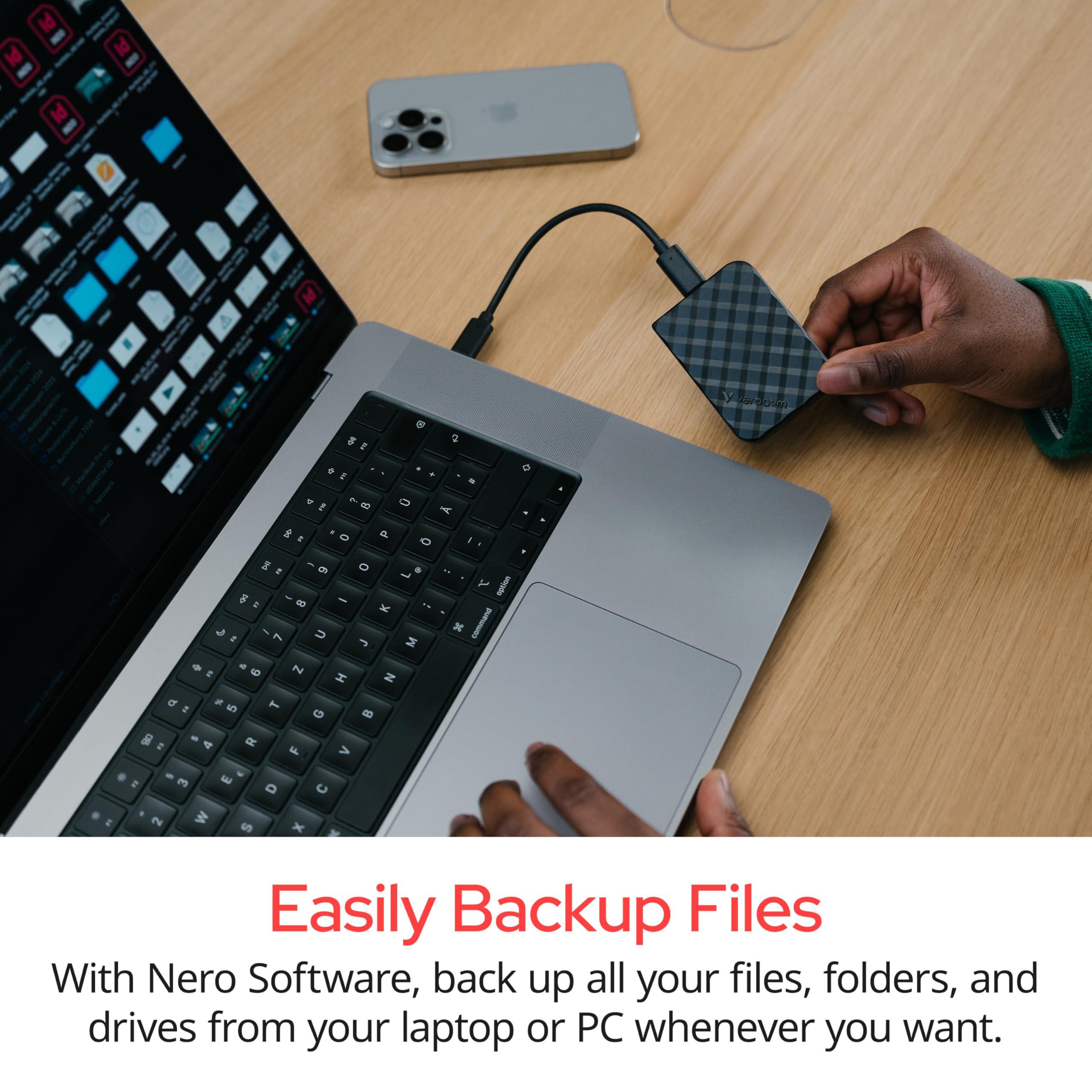 - Contenuto della confezione: 1 x SSD esterno da 1 TB, cavo micro B a USB-A, adattatore da USB A a USB-C, software di backup e formattazione Nero (solo Windows), guida rapida e manuale utente (memorizzato su SSD).