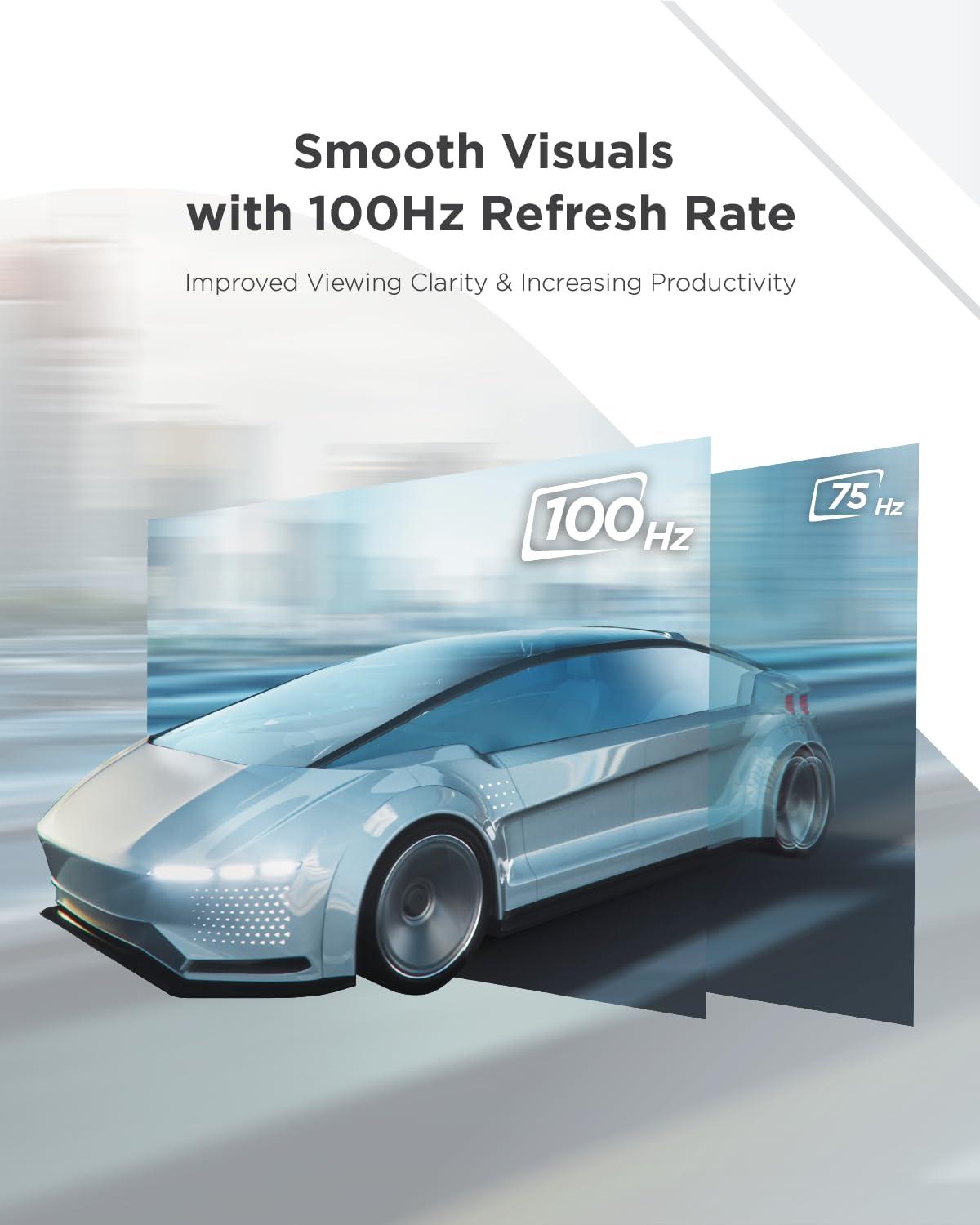 - Frequenza di aggiornamento fluida a 100Hz: Sperimenta una grafica fluida con un rapido refresh rate di 100Hz. La maggiore chiarezza visiva riduce la balbuzie dello schermo e la sfocatura di movimento, aiutando a diminuire la fatica oculare e aumentare la produttività quotidiana.