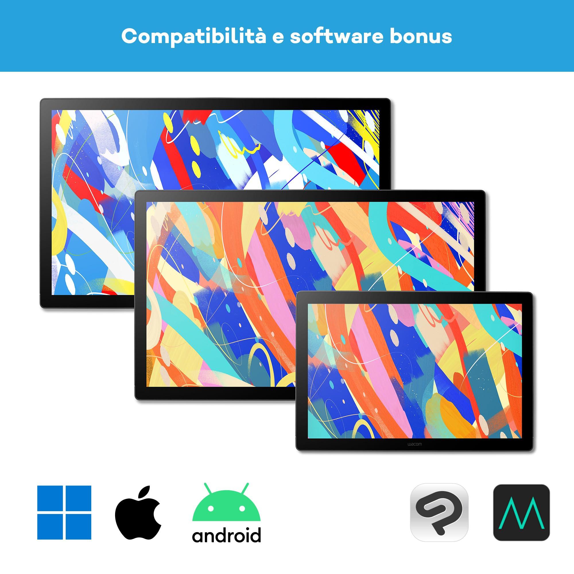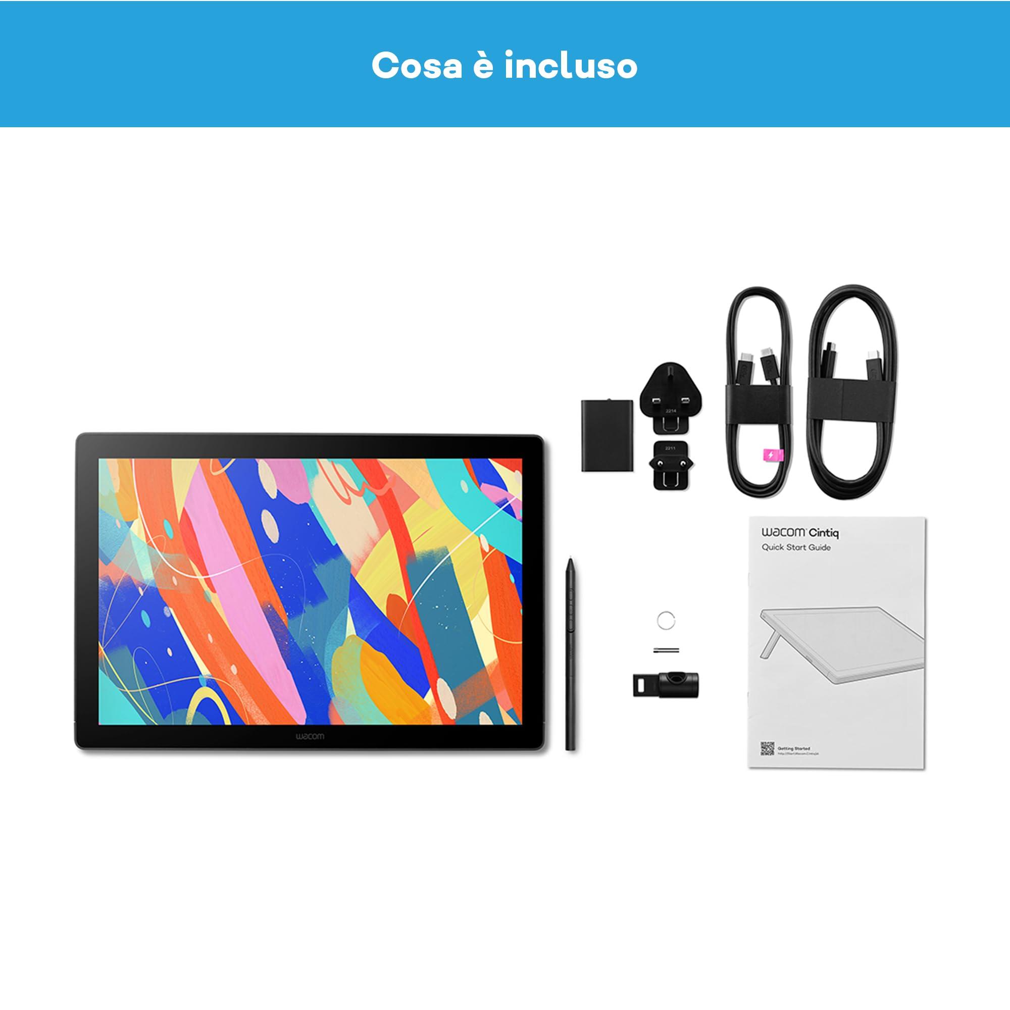 - Contenuto: Cintiq 16, Pro Pen 3, supporto con 1 punta standard e 1 in feltro, estrattore, 2 cavi USB-C (1,8 m), alimentatore, adattatore spina, guida rapida, foglio IPI, garanzia. *Nota: Connessione USB-C richiede DisplayPort Alt Mode e USB Power Delivery. Per HDMI: usare cavi Mini HDMI e USB-C a A (non inclusi).