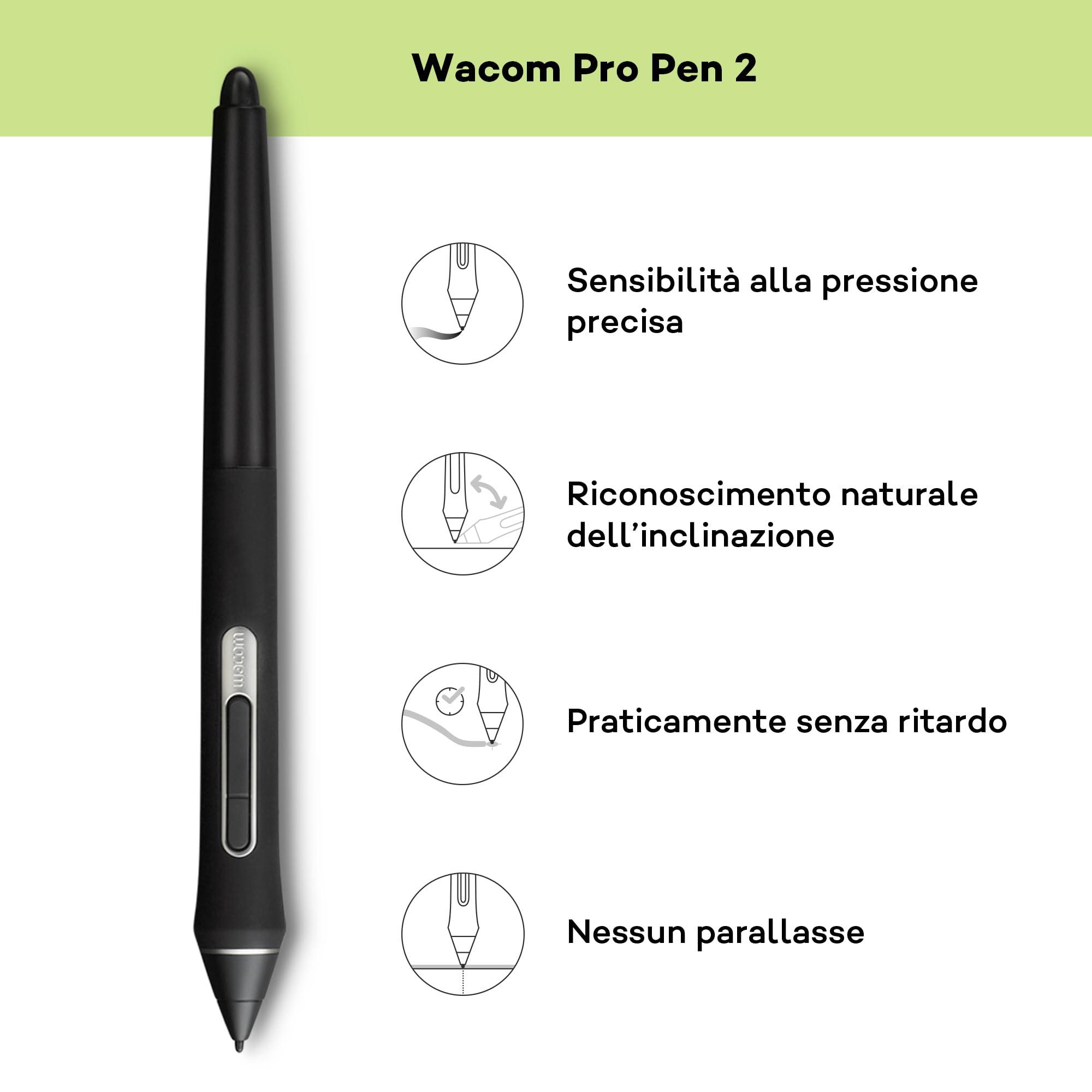 - Con il metodo di risonanza magnetica, gli 8192 livelli di pressione e il riconoscimento dell'inclinazione, la Wacom Pro Pen 2 assicura il massimo controllo per un tratto naturale, preciso e veloce