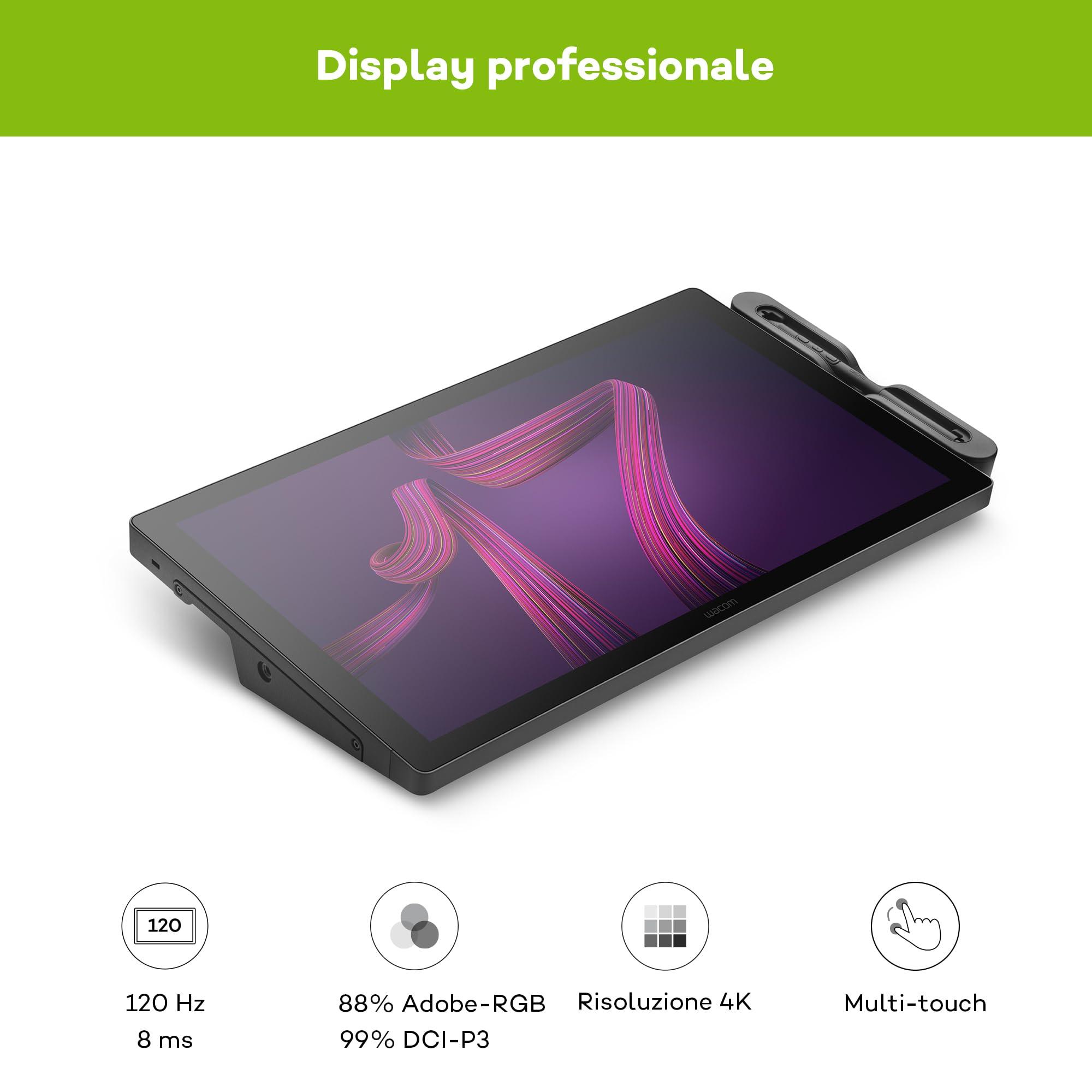 - Con il suo design ergonomico e le tecnologie all’avanguardia, Wacom Cintiq Pro 17 garantisce comfort anche per periodi prolungati. È dotata di intuitivi tasti ExpressKey, di un ingombro contenuto e di uno schermo dalle caratteristiche sorprendenti, come la latenza minima della penna, la frequenza di aggiornamento di 120 Hz e un tempo di risposta di 8 ms. In più, offre un supporto integrato e un sistema di montaggio VESA (75 x 75 mm) per una configurazione ancora più versatile.