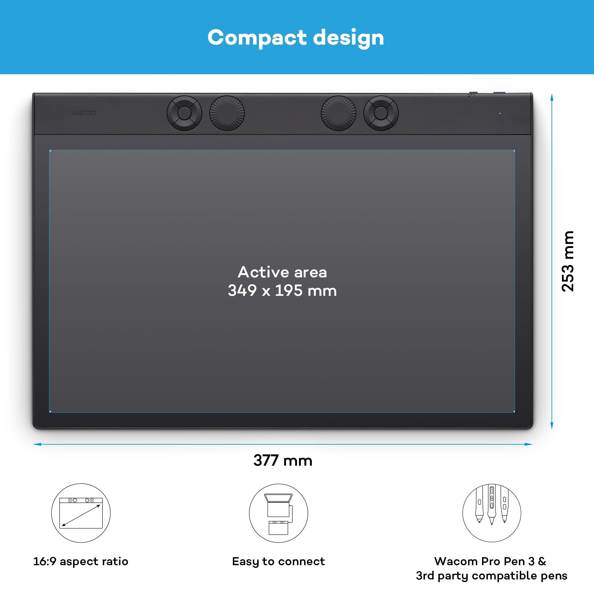 - La nuova tavoletta Wacom, riprogettata con tecnologia avanzata, layout ergonomico e formato ultra-sottile 16:9, offre precisione, comfort e versatilità. Connettività USB e Bluetooth, compatibile con Windows e macOS.