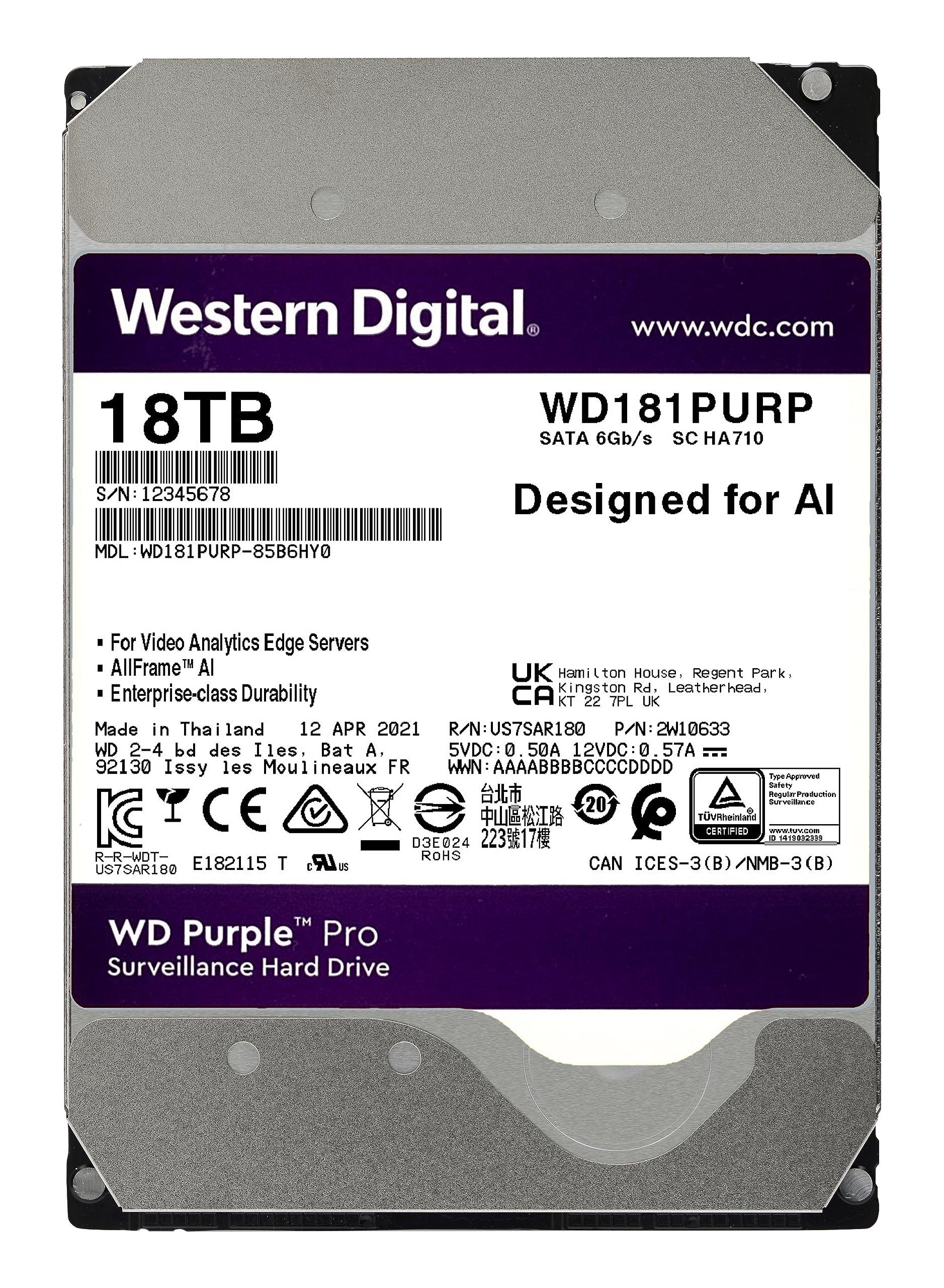 WD Purple Pro 18TB per Smart Video, Hard Disk Interno 3,5” - Tecnologia AI AllFrame, 7200 RPM, 550TB/anno, Cache da 512 MB
