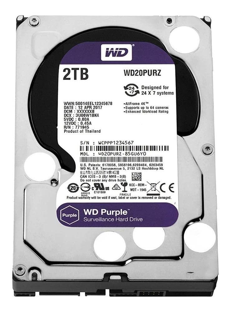Western Digital WD20PURZ WD Purple Hard Disk per Videosorveglianza con Tecnologia Allframe 4K 3.5 Pollici SATA 6 GB/s 180TB/Anno, 64 MB Cache, 5400 RPM, 2 TB, Grigio